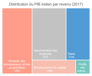 Nous touchons ici la notion de contenu en profits de la croissance économique. Les profits sont en effet une des composantes du PIB. Regardons par exemple la structure du PIB par type de revenus (salaires, loyers, profits, etc.) pour l’Inde et les Etats-Unis.