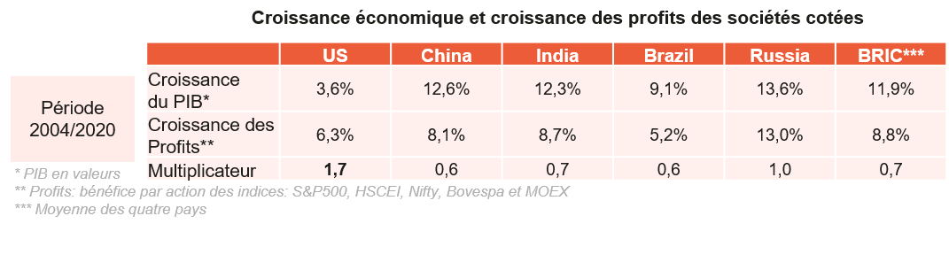 Pour appréhender cette problématique du contenu en profits, nous avons calculé la croissance des profits des indices des quatre pays BRIC (Brésil, Russie, Inde, Chine) et nous l’avons comparée à celle du S&P500. Nous avons fait de même avec la croissance du PIB pour calculer ensuite le rapport entre la croissance des profits et la croissance économique. Les résultats sont présentés dans le tableau ci-dessous :