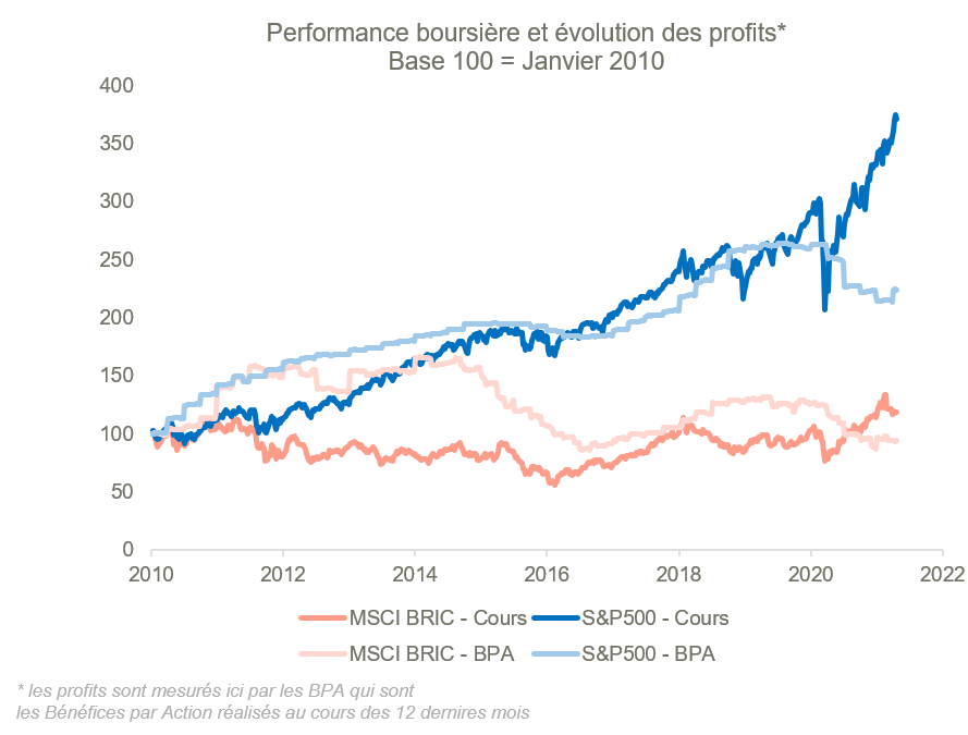 Les raisons de cette incapacité des sociétés des pays BRIC à monétiser le surplus de croissance économique en profits sont multiples. On peut en citer quelques-unes comme les problèmes de gouvernance (poids important de l’état dans l’actionnariat des sociétés cotées), les problèmes institutionnels (corruption, cadre juridique peu performant), les freins structurels (productivité de la main d’œuvre, accès et coût du financement) ou encore conjoncturel (forte dépendance au cycle des matières premières pour certains pays).