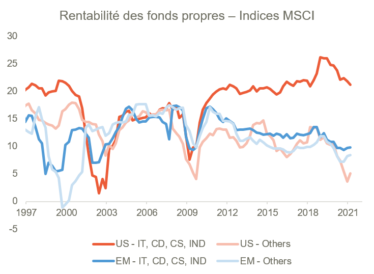Les indices des pays émergents ont pâti très longtemps de leur surexposition aux secteurs peu performants, quasiment régulés comme ceux des services aux collectivités, les télécommunications ou encore, aux banques. La profitabilité de ces secteurs est structurellement faible et entraine mécaniquement un moindre contenu en profits au niveau de l’indice.