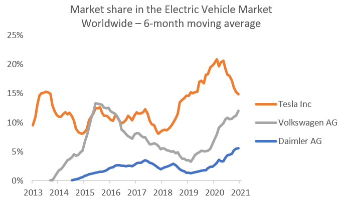 Tesla benefits from an exceptional valuation premium. Some analysts consider Tesla as a pure player in the electric vehicle industry, making it a growth company. Having been well ahead of its competitors, some have mentioned a leader’s premium on the idea of “the winner takes all”. Yet the reality is the following: 1) Tesla has been the leader in the electric vehicle market but is expected to lose its number 1 position as early as this year, and 2) Tesla has been losing market share for a year, since European manufacturers’ vehicles are available for sale.