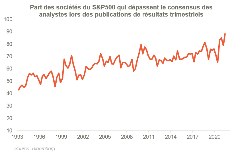 La saison des publications de résultats pour le 1er trimestre 2021 est bien entamée et on constate une fois de plus, un taux de surprise extrêmement élevé pour ce cru. Il s’agit même d’un record historique: 87% des sociétés du S&P500 ont battu les attentes des analystes lors de la publication de leur bénéfice par action.
