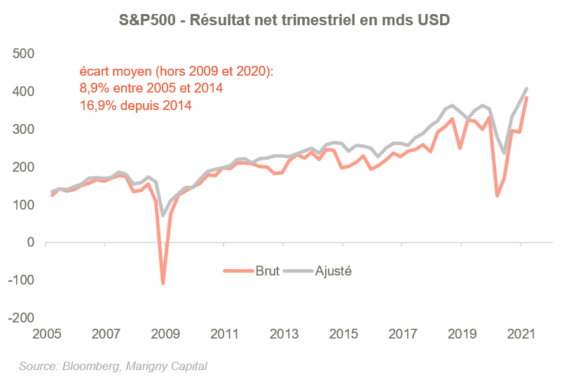 4. Les sociétés publient des résultats « ajustés ». Ajusté signifie qu’elles vont pouvoir nettoyer leurs comptes en considérant comme « non-récurrents » des éléments ayant affecté négativement leurs profits. Cet habillage comptable a pris un essor particulièrement important ces dernières années (voir graphique ci-dessous) et rend la tâche de prévision des analystes plus difficile.