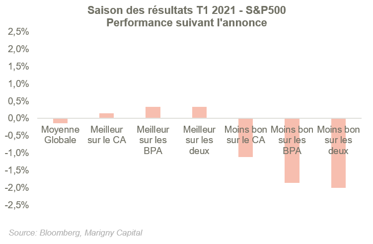 Nous présentons sur le graphique suivant la performance moyenne des titres lors de leur publication de résultats du 1er trimestre 2021, selon la surprise (positive ou négative) au niveau du chiffre d’affaires et/ou du bénéfice par action.
