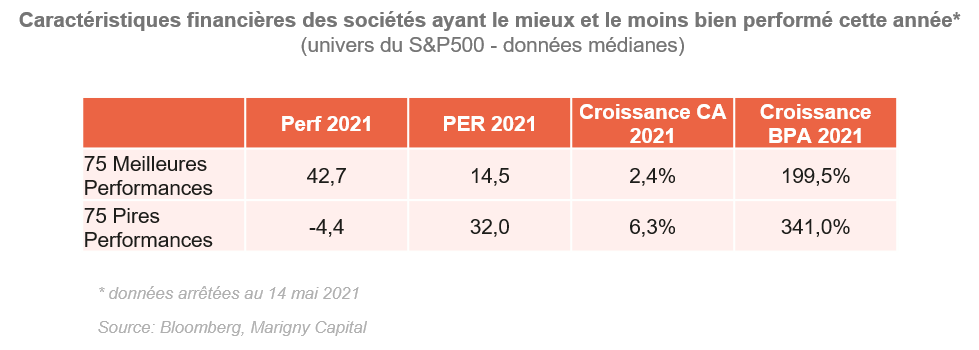 Le fait que les sociétés ayant le mieux performé pendant cette saison de résultats aux Etats-Unis soient celles avec une valorisation plus modeste, nous apprend qu’il y aurait comme un phénomène de « retour à la moyenne », une limite à l’expansion des multiples de valorisation.